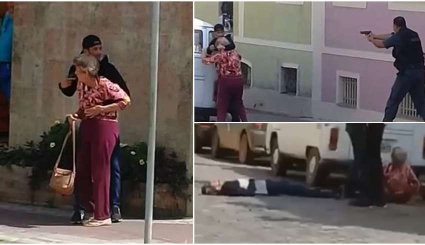Nas imagens gravadas por um morador, é possível ver o assaltante armado, segurando a vítima, enquanto um policial apontava a arma em sua direção. Diversas pessoas gritavam para que ele soltasse a idosa, mas ele não soltava. Em certo momento, a senhora tropeça e cai no chão, e o policial atira contra o bandido, que morre no local. A idosa, que ficou por cerca de 10 minutos sob a mira de um revólver, não se feriu. A identidade do bandido ainda não foi revelada.