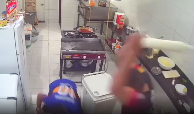 BRASIL | Na noite desta quinta-feira (30), por volta das 21h, imagens do circuito interno de segurança de uma lanchonete mostra o momento em que um assaltante armado de pistola aborda um homem na cozinha de uma lanchonete.