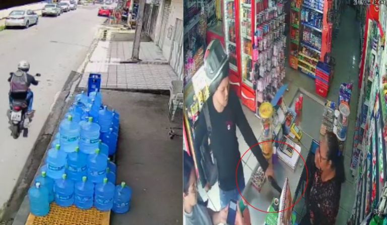 Ele se afasta, retira uma arma que estava escondida em sua bolsa e volta para o balcão, para pegar o celular de uma das funcionária. Depois, exige que a mulher do caixa entregue toda a renda do estabelecimento.
