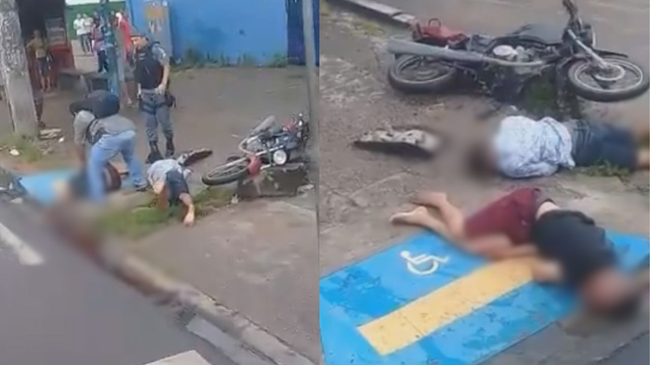 Uma mulher que passava de ônibus pelo local filma a dupla caída no chão. Um deles aparece com a cabeça sangrando. Ela até chega a dizer “vixe, esse aqui morreu já”, mas a informação do óbito não foi confirmada pelos policiais.