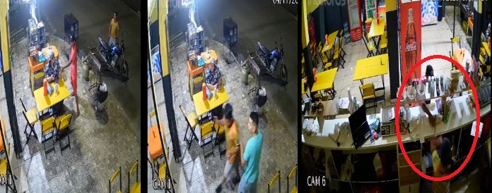 O segundo assaltante, que trajava uma camisa azul e calça jeans, chegou ordenando que ele retornasse para dentro do estabelecimento, o ameaçando com uma arma de fogo. Dentro do estabelecimento, o primeiro assaltante rende a operadora de caixa, apontando uma arma de fogo bem no seu rosto, enquanto exigia a entrega da renda.