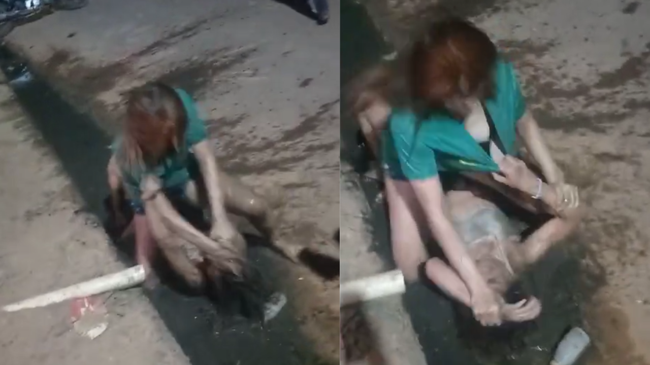 O vídeo divulgado em grupos de conversa mostra duas mulheres brigando na lama embaixo de uma tubulação de esgoto.