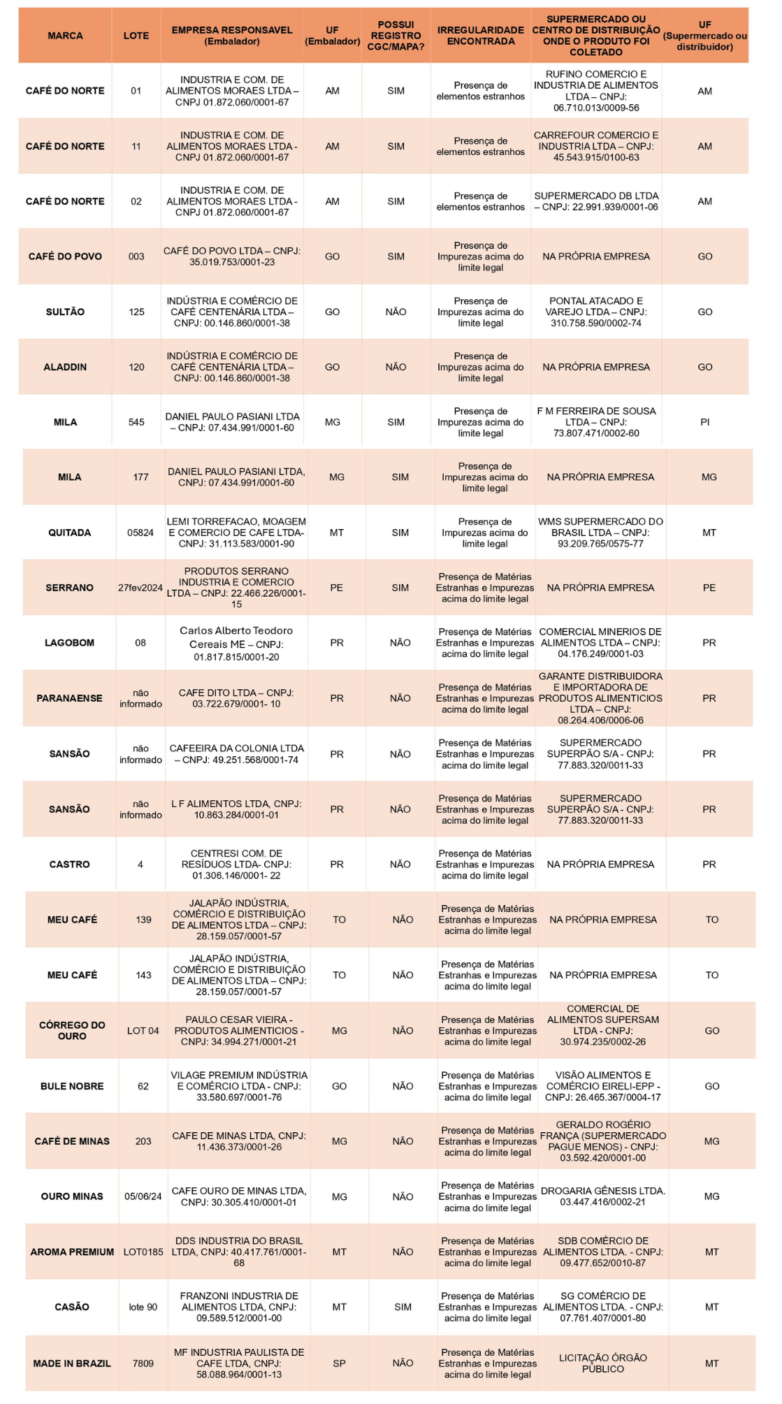 Segundo o Mapa, foram encontradas matérias estranhas e impurezas ou elementos estranhos acima dos limites permitidos pela legislação vigente, a Portaria nº 570. Os lotes 01, 11, 02 devem ser recolhidos pelas empresas responsáveis.