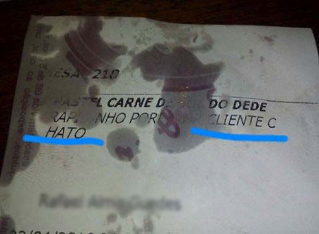 Segundo ele ao chegar no estabelecimento pediu um pastel de carne seca com queijo coalho e após vários minutos de espera e diversas reclamações feitas ao atendente, o pedido que foi entregue não correspondia com o escolhido pelo cliente, que mais uma vez foi surpreendido com a reação do atendente. Além de fazer pouco caso alegando que o cliente havia pedido algo que não existia no cardápio, quando o pedido certo chegou, veio com uma ‘surpresinha’ escrito na comanda que acabou retornando para a mesa do cliente por engano a seguinte observação:”rapidinho por favor, cliente chato”.