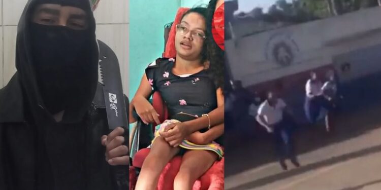 Conforme descreve o relato da polícia, o homem pulou o muro da escola no início da manhã e atingiu a estudante cadeirante com golpes de arma branca — ele levava uma faca e uma machadinha — e disparos de um revólver calibre 38. A PM também encontrou uma bomba caseira com o rapaz.