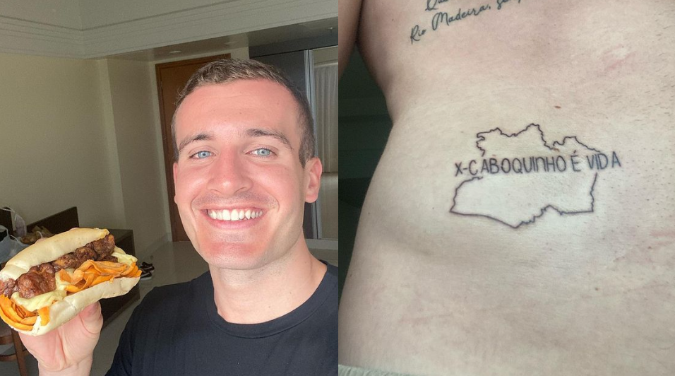 MANAUS (AM) – Apaixonado pelo X-Caboquinho desde que chegou em Manaus, o australiano Simon Gurney, de 26 anos, resolveu tatuar o desenho do sanduíche típico baré na pele. O jovem, que está viajando por todo o Brasil e estendeu sua estadia na cidade, fez uma enquete no Instagram e os seguidores o ajudaram a escolher a frase que estamparia a iguaria.