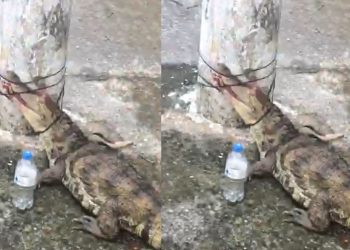 MANAUS - A imagem de um jacaré amarrado ao poste no Passeio do Mindu, no bairro Parque Dez, nesta terça-feira...