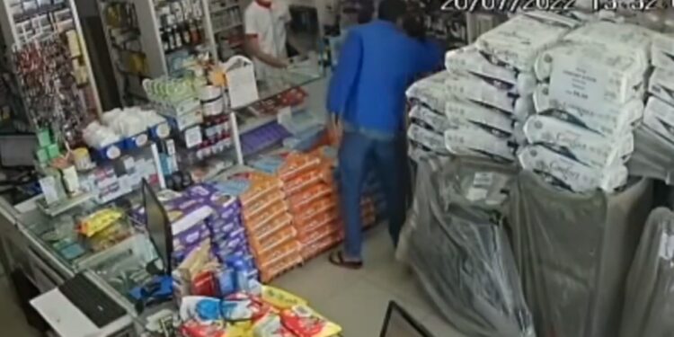 Nas imagens, o homem entra de moletom azul no estabelecimento e mostra arma na cintura a um dos funcionários. Ele vai ao caixa e aborda o atendente. Em seguida, beija a testa da cliente enquanto a abraça de lado e se desculpa pelo ato.