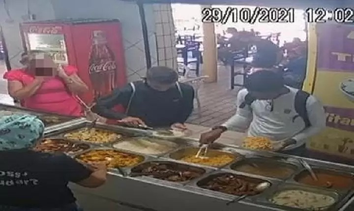 As câmeras de segurança do estabelecimento registraram o momento que os dois suspeitos, um vestido com uma camisa de cor preta e o outro de camisa branca, pegam comida no self-service do restaurante às 12h02.