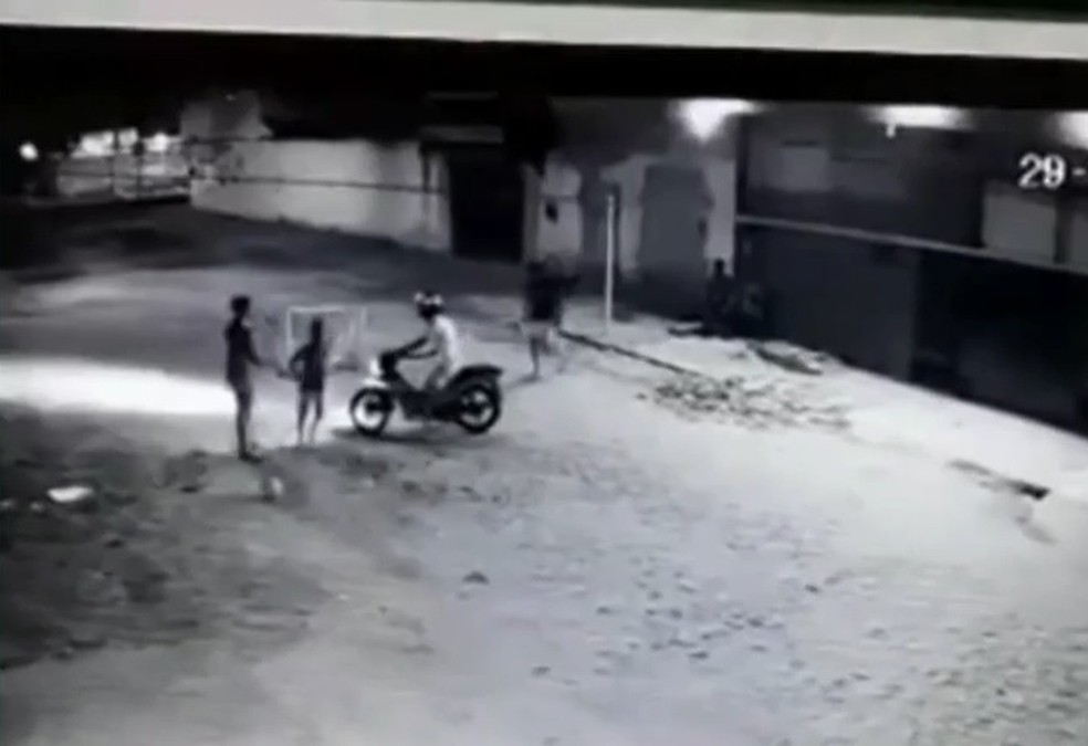 Nas imagens, as crianças brincam de futebol e outras pessoas estão sentadas na calçada. Dois homens aparecem na moto e o garupeiro desce do veículo armado e vai em direção ao jovem. Enquanto isso, o motociclista comparsa monitora as crianças. Após pegar o aparelho celular os assaltantes fogem.