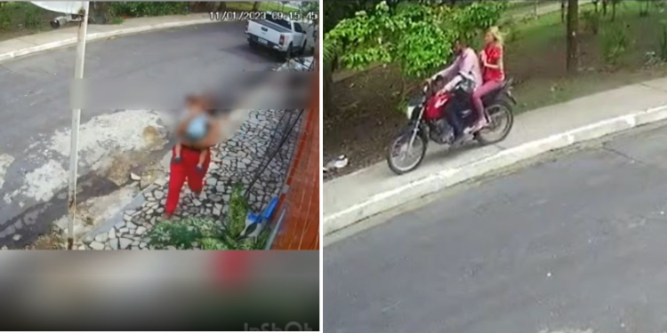 Câmeras de segurança gravaram o momento em que babá estava caminhando com a criança e mais alguns familiares, quando o casal chegou em uma moto e a abordou com a arma na cintura, exigindo que ela entregasse a criança.