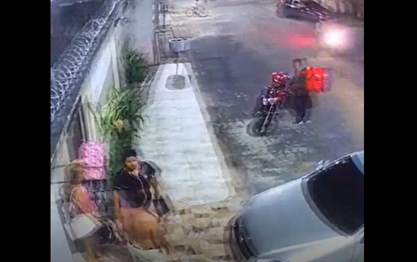 Nas imagens, é possível ver três pessoas conversando, enquanto o trabalhador entrega a encomenda deles. Eles aguardam para efetuar o pagamento e são surpreendidos pela dupla que chegou em uma motocicleta.