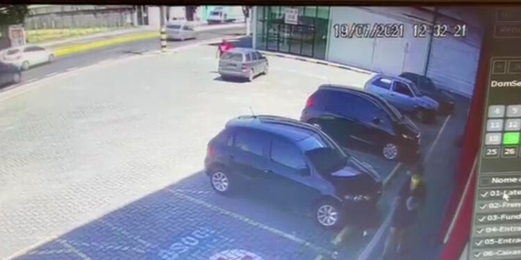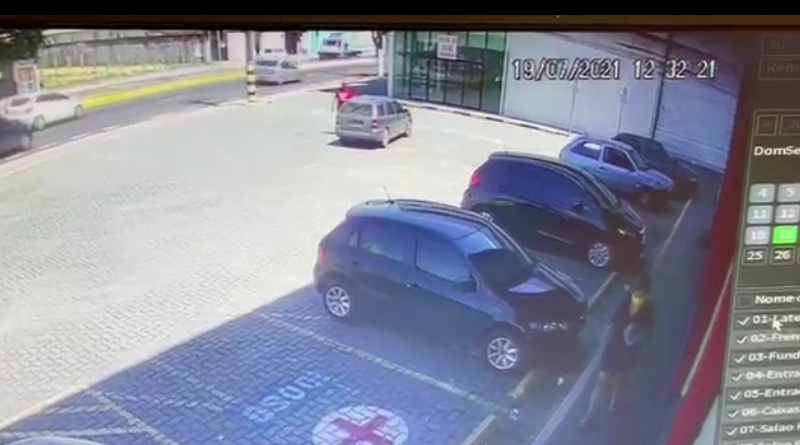 Nas imagens é possível ver o carro da vítima, um Honda Fit preto adentrando o estacionamento da drogaria. Logo atrás, um outro veículo modelo Parati de cor verde, estaciona ao lado do Honda Fit.