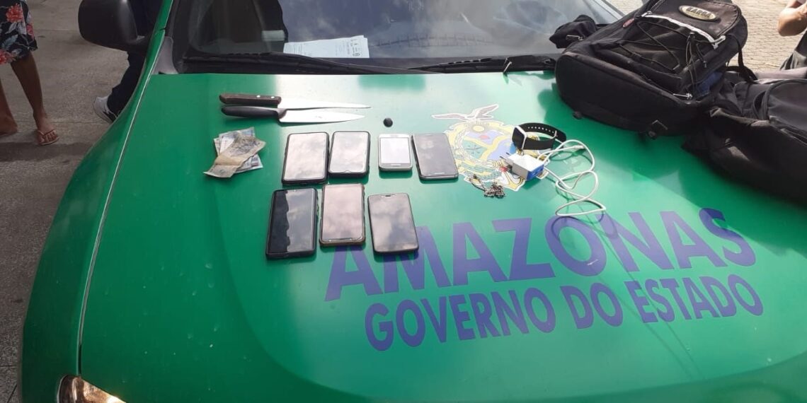 A ação resultou na apreensão de duas armas brancas do tipo faca, sete aparelhos celulares produtos do roubo aos passageiros, um valor em dinheiro não informado, além de duas mochilas, um relógio, colar prateado e um carregador de celular.