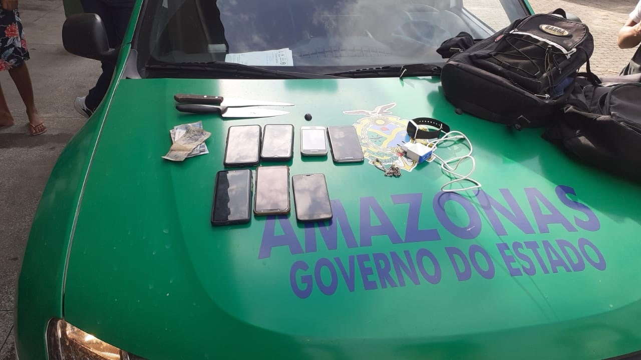 A ação resultou na apreensão de duas armas brancas do tipo faca, sete aparelhos celulares produtos do roubo aos passageiros, um valor em dinheiro não informado, além de duas mochilas, um relógio, colar prateado e um carregador de celular.