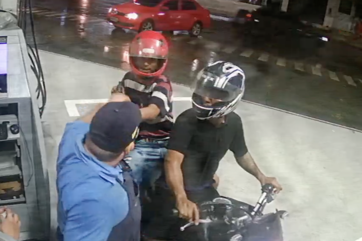 Nas imagens é possível ver que eles ameaçam atirar e exigem toda a renda do posto. A ação é rápida e dura poucos segundos. Um deles vestia camisa preta e o outro listrada.