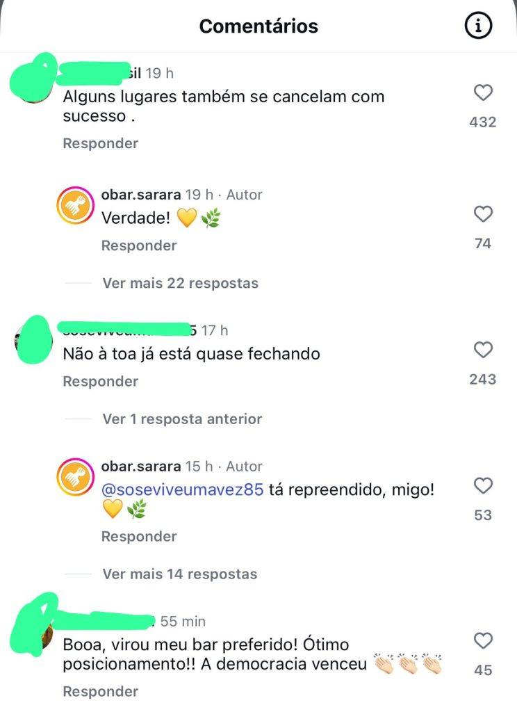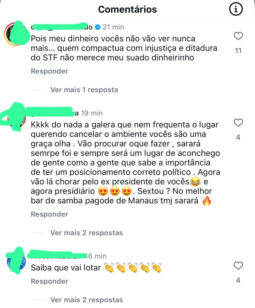 Defensores do Sarará saíram em apoio à casa. “Ótimo posicionamento!! A democracia venceu”, comentou um apoiador, em resposta às tentativas de cancelamento.