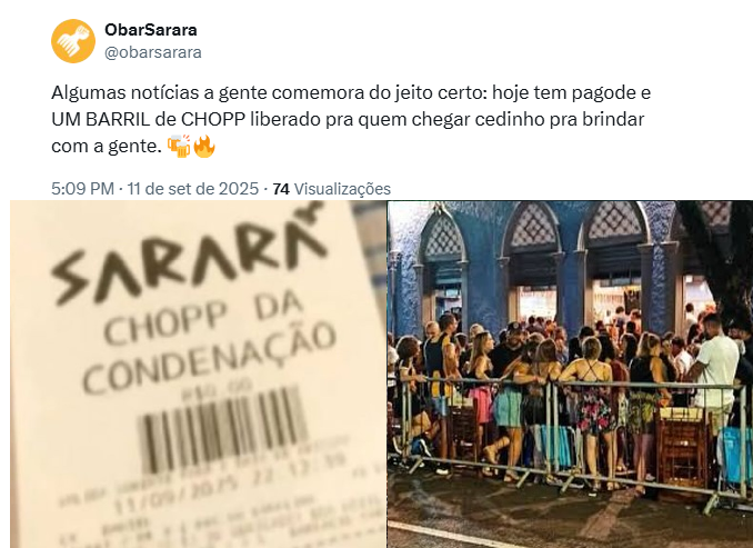 “Algumas notícias a gente comemora do jeito certo: hoje tem pagode e UM BARRIL de CHOPP liberado pra quem chegar cedinho pra brindar com a gente”, dizia a postagem, que rapidamente viralizou acumulando mais de 1,2 mil comentários e 2,3 mil interações. Além disso, a comanda desta quinta-feira também chamou atenção com o seguinte texto: “chopp da condenação”.