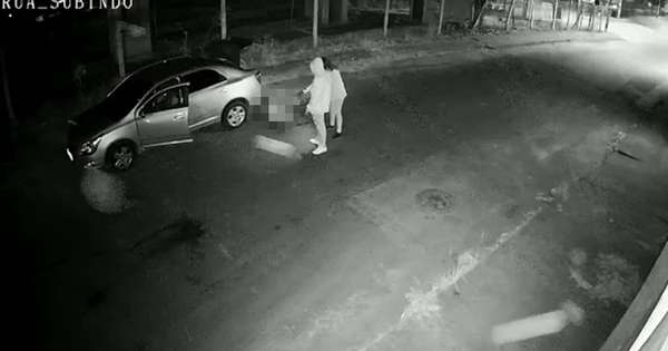 O crime foi registrado por câmeras de segurança. A cena, que dura cerca de dois minutos, entre 5h19 e 5h21, é possível ver um carro cinza sedã chegando ao local. O casal desce, vai até o porta-malas e retiram a vítima.