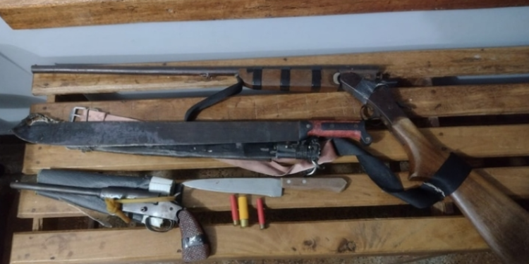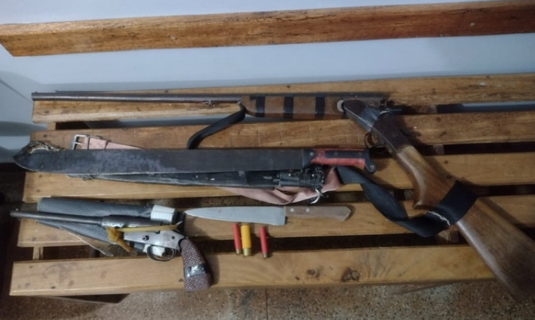 A polícia foi chamada ao local e conseguiu deter o indivíduo, que estava bêbado e não teve o nome divulgado. Com ele a polícia apreendeu armas caseias e facas.