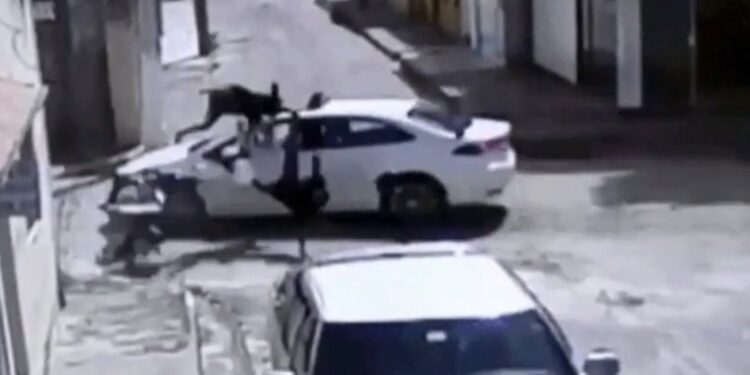 A gravação mostra o casal e o bebê seguindo em baixa velocidade, na motocicleta. Quando a família chega em um cruzamento com outra via, o carro surge em alta velocidade e atinge os três. As imagens mostram que o bebê e os pais foram arremessados e caíram no chão.