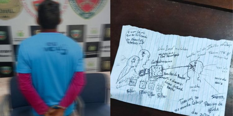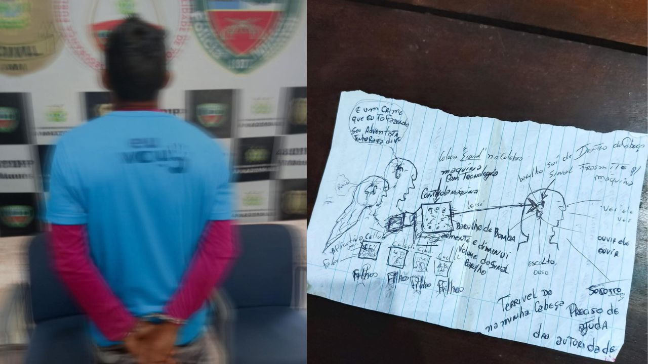 Durante a abordagem, o agressor apresentou um comportamento confuso e alegou ter engolido um chip, acreditando que a vizinha havia criado uma “máquina de controle mental” que estaria colocando sua vida em risco. Segundo os policiais, ele chegou a mostrar desenhos e anotações que ilustrariam o suposto equipamento.