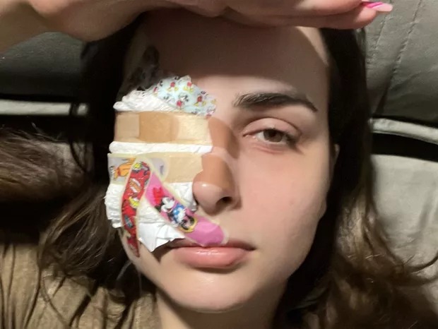 Depois do acidente, a influenciadora ficou sem conseguir abrir os dois olhos.