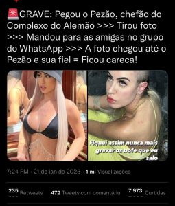 Tudo indica que a foto foi vazada pelas próprias amigas de Geovana. A blogueira que também é casada-, enviou a foto no maior love para um grupo no WgatsApp, que está apenas ela e as “amigas”, a foto vazou e chegou até a esposa do chefão do CPX.