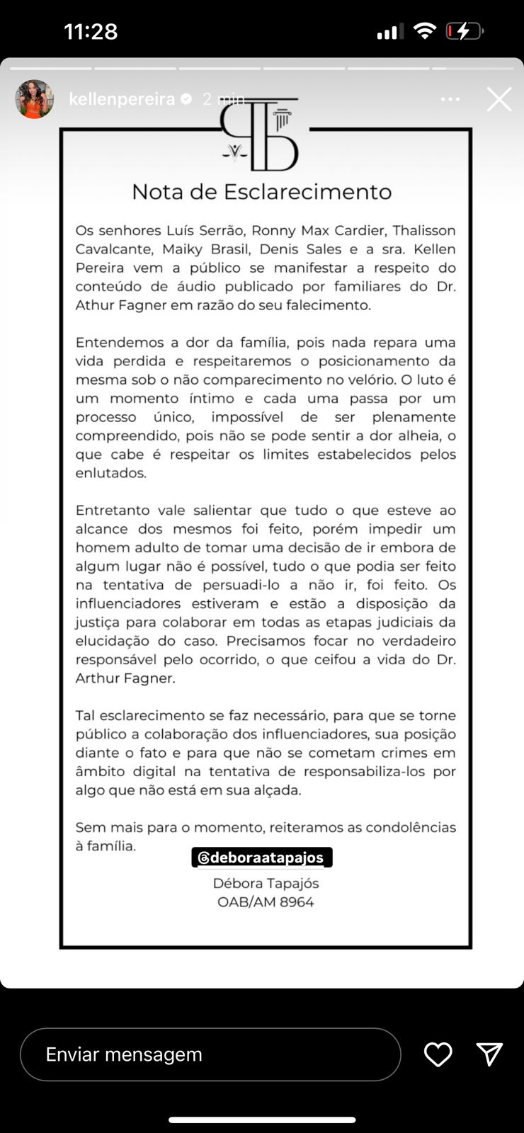 MANAUS – Depois que a família do biomédico Arthur Fagner da Silva, de 33 anos, proibiu amigos e a blogueira Kellen Pereira de irem ao velório dele em Manaus, ela e os amigos rebateram. Luís Serrão, Ronny Max Cardier, Thalisson Cavalcante, Maiky Brasil, Denis Sales e a própria Kellen Pereira assinam a nota.