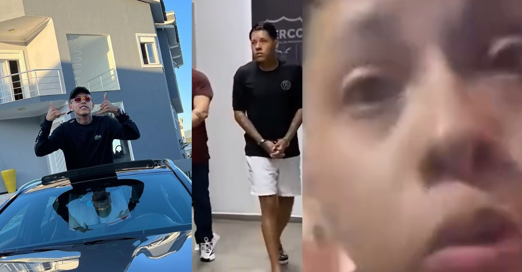 Na delegacia preso, e sem a transmissão do Insta, ele surge tranquilo e marrento com as algemas.