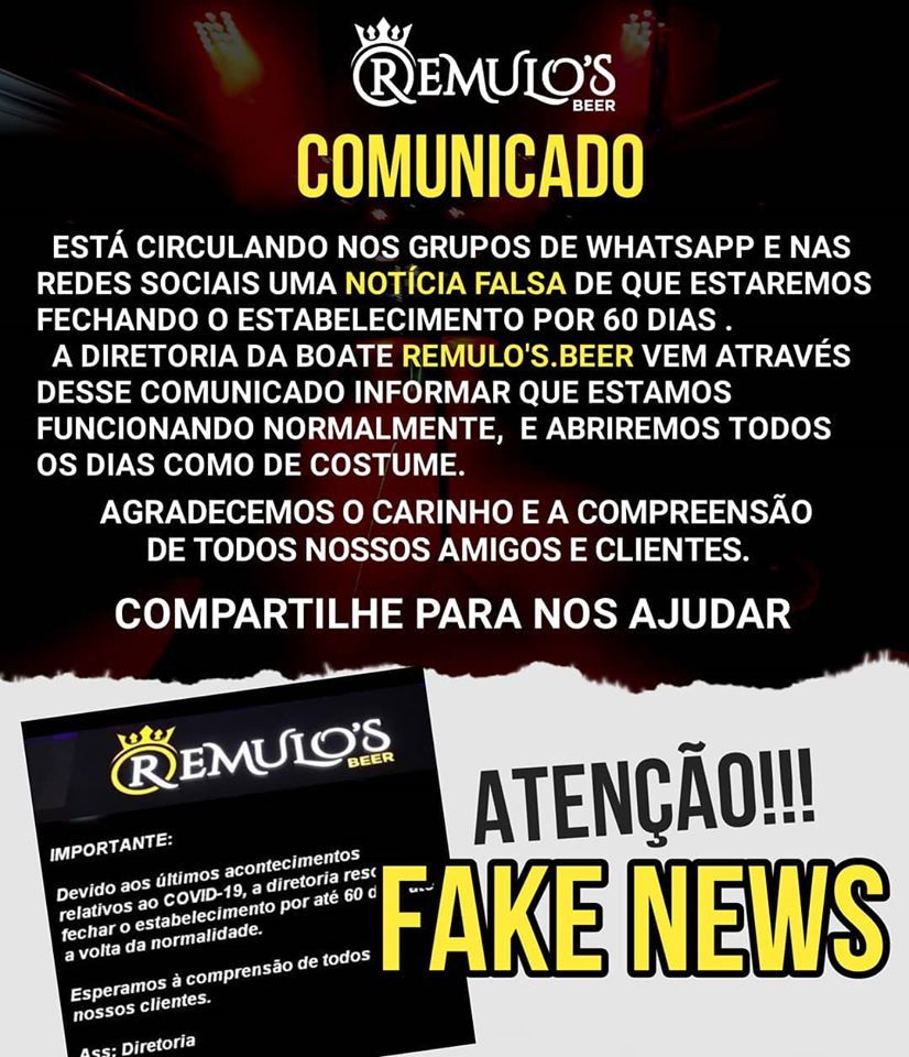 “Está circulando nos grupos de whatsapp e nas redes sociais uma notícia falsa de que estaremos fechando o estabelecimento por 60 dias. A diretoria da boate Remulo’s.Beer vem através desse comunicado informar que estamos funcionando normalmente, e abriremos todos os dias como de costume”.