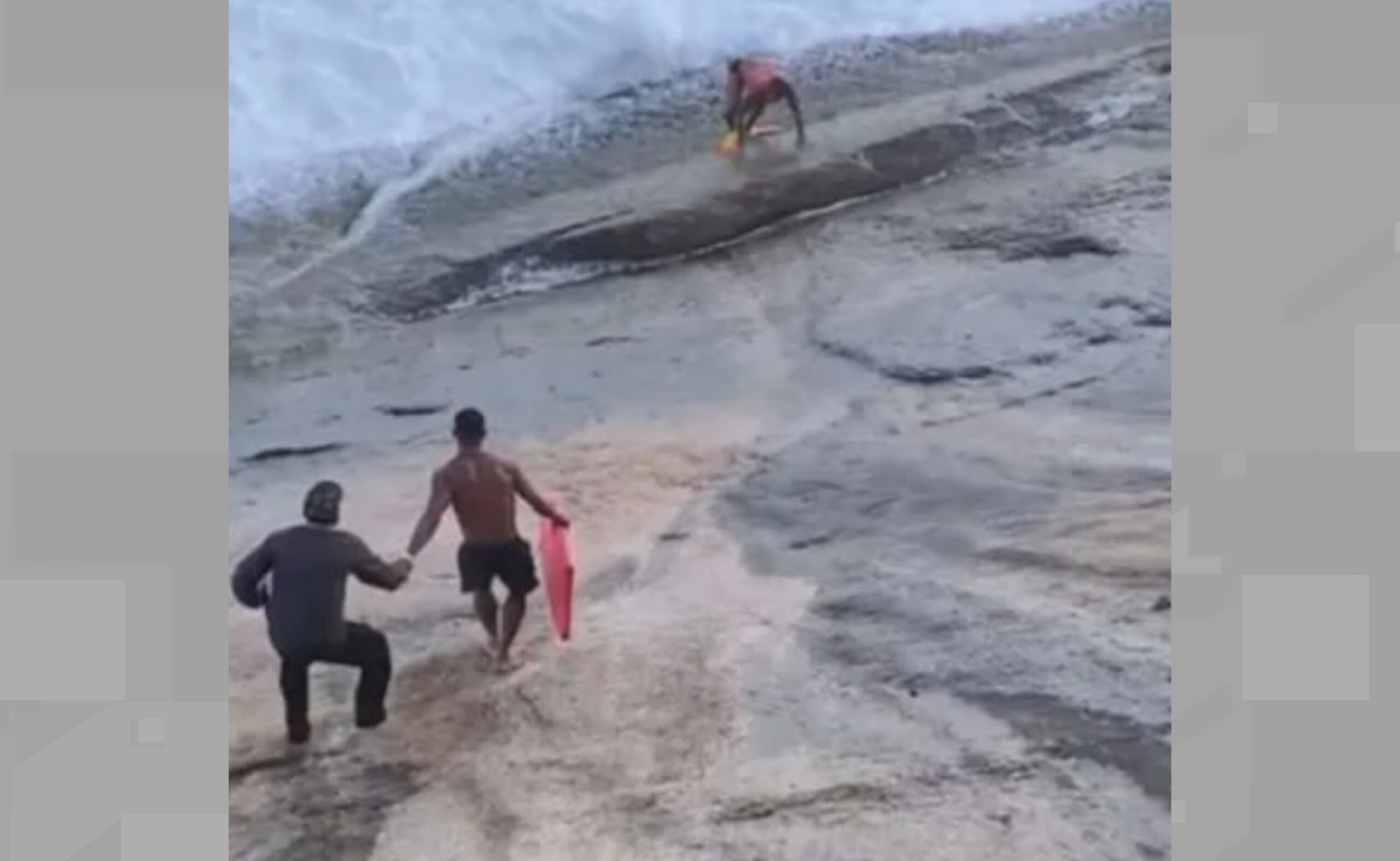 Durante a ocorrência, um dos salva-vidas que participou do resgate também foi puxado pela correnteza e jogado contra as pedras.