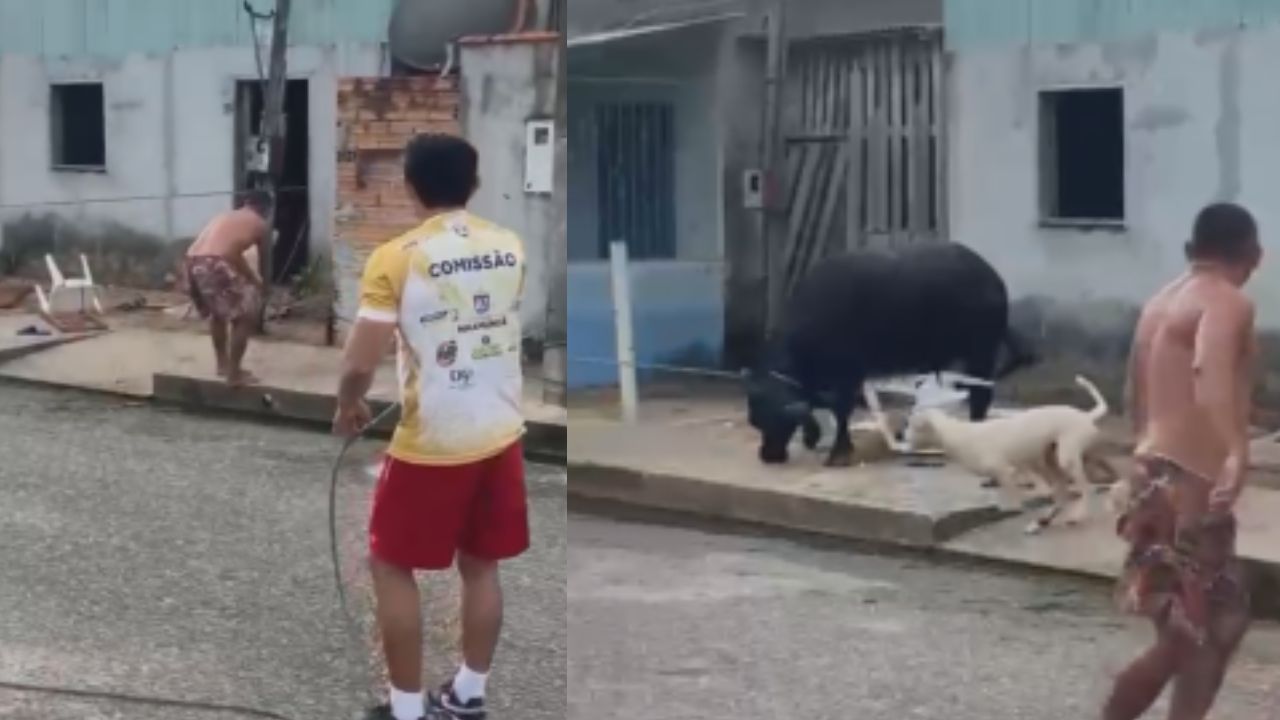 Nas imagens, vários homens aparecem tentando laçar o animal e levá-lo de volta para o abate. O boi resiste, mas é retirado da casa.