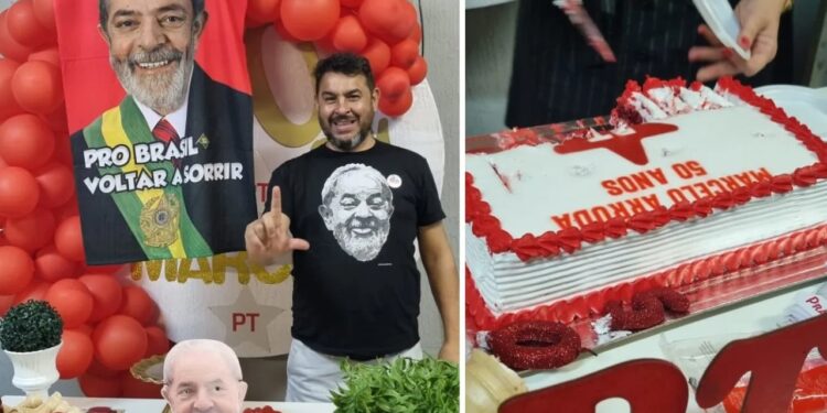O bolo de aniversário tinha a estrela do PT, a decoração tinha imagens de Lula e Marcelo Arruda usava uma camiseta com a foto do ex-presidente. Arruda disputou as eleições municipais em 2020 como candidato a vice-prefeito de Foz do Iguaçu pelo PT.