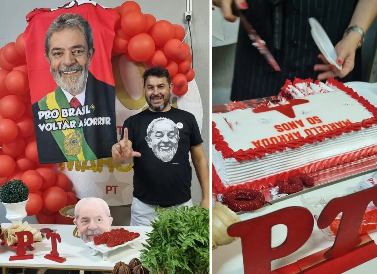 O bolo de aniversário tinha a estrela do PT, a decoração tinha imagens de Lula e Marcelo Arruda usava uma camiseta com a foto do ex-presidente. Arruda disputou as eleições municipais em 2020 como candidato a vice-prefeito de Foz do Iguaçu pelo PT.