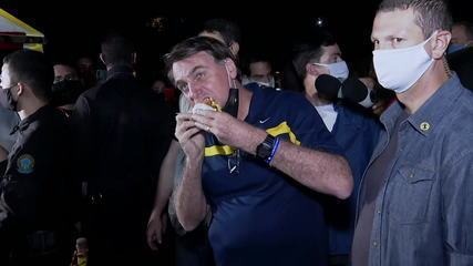 DISTRITO FEDERAL | Na noite deste sábado, 23, o presidente Jair Bolsonaro passeou por Brasília e novamente gerou aglomerações. Ele provocou tumulto ao aparecer numa barraca de cachorro-quente para fazer um lanche.