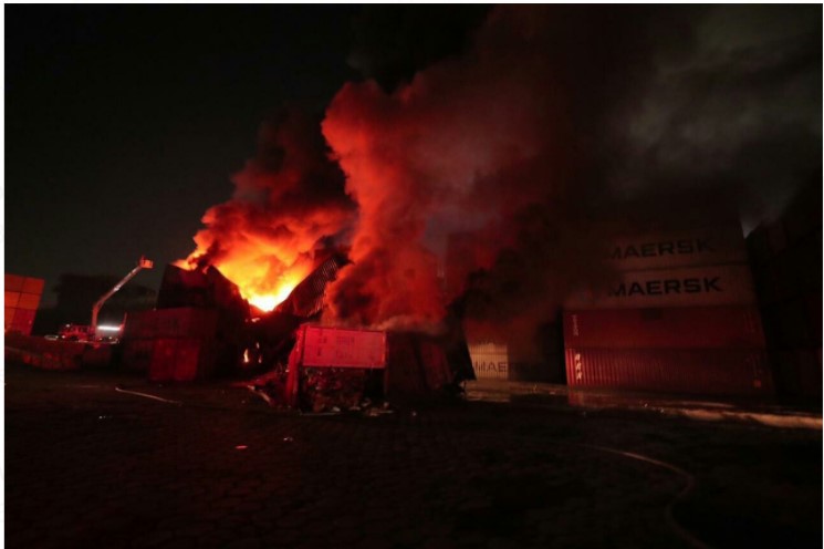 Segundo os relatos, uma explosão ocorreu depois que um dos contêineres foi atingido por uma descarga atmosférica (raio). À frente dos 16 contêineres, que foram rapidamente tomados pelo fogo, havia 11 tanques com armazenamento de produtos químicos perigosos, que ofereceram grande risco de explosão durante às primeiras 14 horas de combate, quando as chamas estavam intensas na área confinada. Ao menos 35 contêineres estavam dispostos na área mais quente.