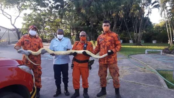 CEARÁ|Nesta terça-feira (11), o Corpo de bombeiros foi acionado para capturar uma cobra píton birmanesa de três metros que estava no telhado de uma casa em Fortaleza, Ceará. A serpente que pode chegar a 8 metros de cumprimento, provocou pavor diante dos vizinhos que presenciaram o resgate.