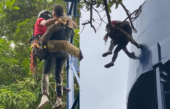 MANAUS (AM) – O Corpo de Bombeiros Militar do Amazonas (CBMAM) resgatou dois homens, nesta segunda-feira (29), que estavam presos no alto de uma caixa d’água, a cerca de 20 metros de altura, após se intoxicarem durante a pintura do equipamento, na rua das Pedras, no bairro Tarumã-Açu, Zona Oeste de Manaus.