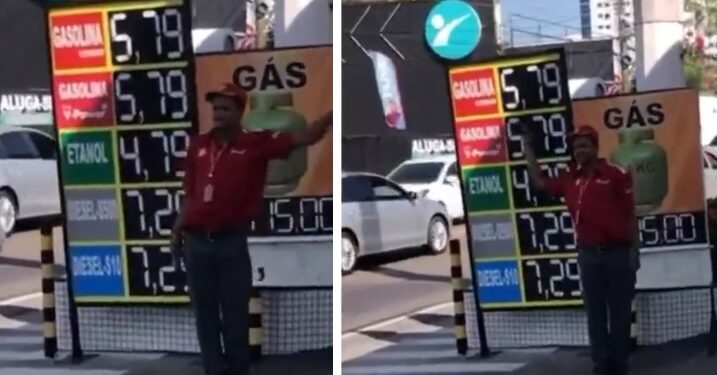 No vídeo, o funcionário aparece fazendo movimentos soltos e até chama os veículos para o posto de gasolina, na frente da tabela dos preços de combustíveis. Quem filma a cena, não segura o riso e mostra o ‘boneco humano’ tentando atrair clientes.