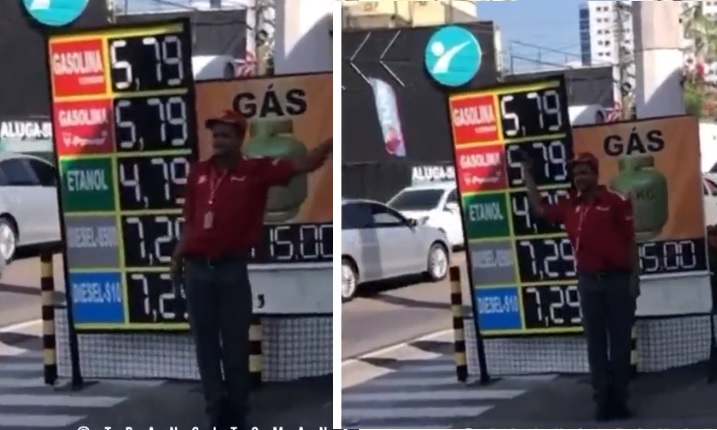 No vídeo, o funcionário aparece fazendo movimentos soltos e até chama os veículos para o posto de gasolina, na frente da tabela dos preços de combustíveis. Quem filma a cena, não segura o riso e mostra o ‘boneco humano’ tentando atrair clientes.