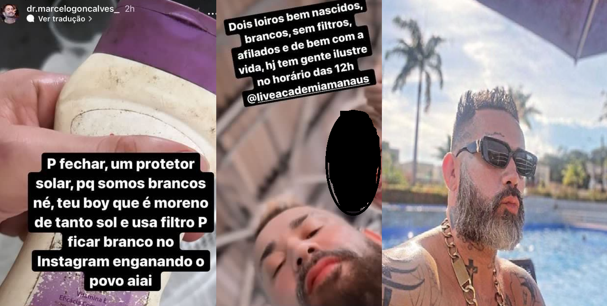 “Pra fechar, um protetor solar porque somos, brancos, né?! Teu boy que é moreno de tanto pegar sol e usa filtro pra ficar branco no Instagram, enganando o povo”, escreveu o advogado em um story, dando a entender que pessoas cuja a pele é mais escura usam filtro do aplicativo para parecerem mais “brancos” e enganar os outros.