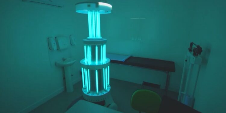 As universidades e a empresa de tecnologia robótica, que foram responsáveis pela criação do equipamento, explicaram que ele funciona com uma luz UV germicida que penetra e destrói o material genético de vírus e bactérias.