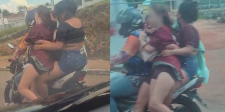 Nas imagens, é possível ver um mototaxista transportando três passageiras na garupa de uma motocicleta, em uma prática que infringe as normas de trânsito e representa risco à segurança de todos os envolvidos.