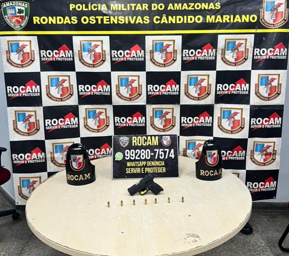 De acordo com policiais militares das Rondas Ostensivas Cândido Mariano (Rocam), uma equipe foi acionada ao local e, durante buscas pela região, encontrou na residência do investigado uma pistola calibre 9 milímetros, sete munições e um carregador.