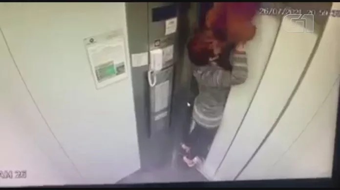A mulher ainda consegue abrir parcialmente uma das portas do elevador e tenta tirar o animal da situação, para impedir que ele fosse enforcado pela força do equipamento, mas não consegue. Em seguida, ainda segurando o animal pendurado, a mulher liga para a portaria pelo interfone de emergência e pede ajuda.