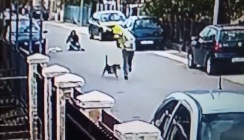 No vídeo, o suspeito se aproxima da mulher e agarra ela por trás, empurrando-a no chão, na intenção de assaltá-la. O cachorro que estava acompanhando a cena, no mesmo momento, corre para resgatá-la.