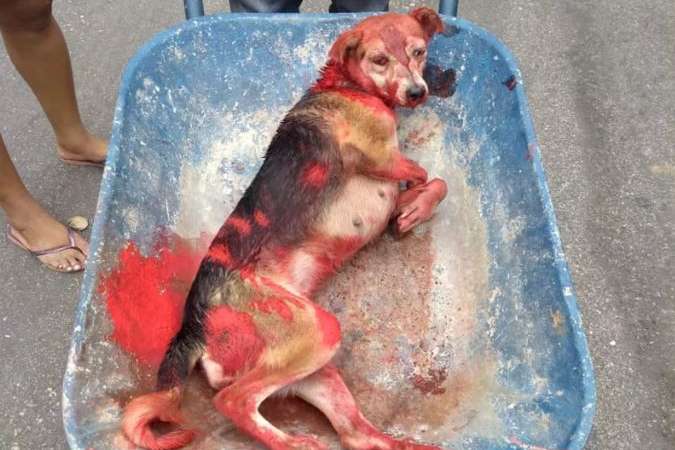 A cadela foi resgatada pela estudante Talita Portilho, que é vizinha do suspeito e foi ao local depois de ouvir os gritos. Talita denunciou os maus-tratos e disse que, quando ameaçou chamar a polícia, o homem jogou tinta vermelha no animal.