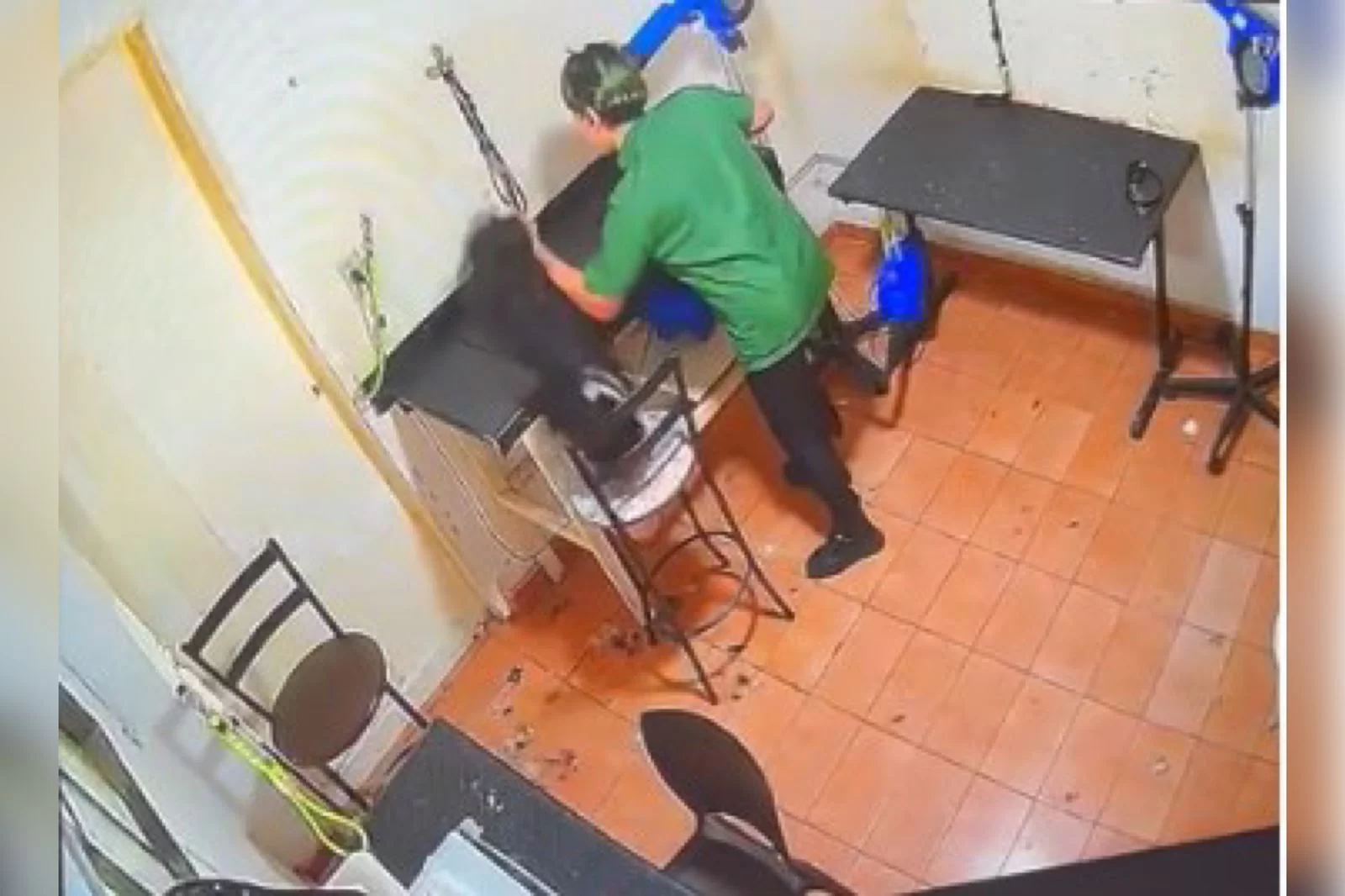O animal foi brutalmente espancada até a morte. Nas imagens, Laurice Lima Damasceno, dá socos enquanto o animal tenta fugir pulando pela mesa de tosa.