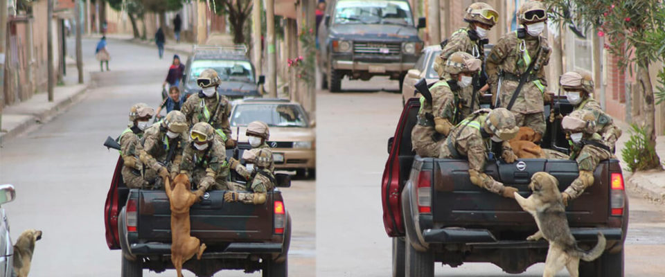 BOLÍVIA | Uma publicação que mostra dois cães de rua invadindo carros militares na Bolívia, chamou muita atenção nas redes sociais. Os cães foram acolhidos pelos soldados, após pularam, literalmente, para dentro do carro onde os militares estavam.